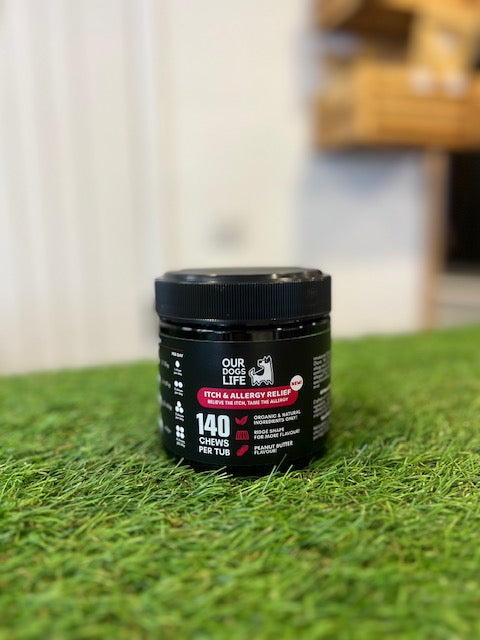Introducing OurDogsLife Itch and allergy relief chews. Your dogs ultimate companion for allergy relief. Are your furry friends constantly scratching and feeling uncomfortable due to allergies? Our itch and allergy chews are specially crafted with your dogs well being in mind.