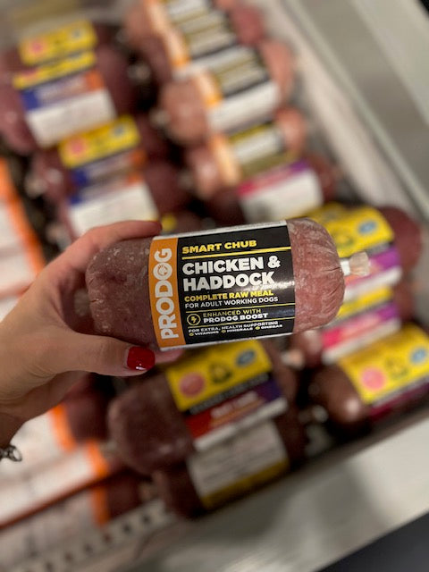 Seriously clever nutrition from ProDog. A complete raw dog food meal with zero veg, cleverly packed into a sleek, minimal waste chub packaging. Our Chicken & Haddock Smart Chub is a no-compromise, balanced raw recipe for working dogs. With an irresistible mix of higher welfare British chicken meat, Atlantic Haddock and ground chicken bone, it skips the veg and instead gets its full nutritional punch from our bestselling dog multivitamin and mineral supplement, ‘Boost’. Every bite delivers clean, intelligent fuel for dogs who thrive on real food.